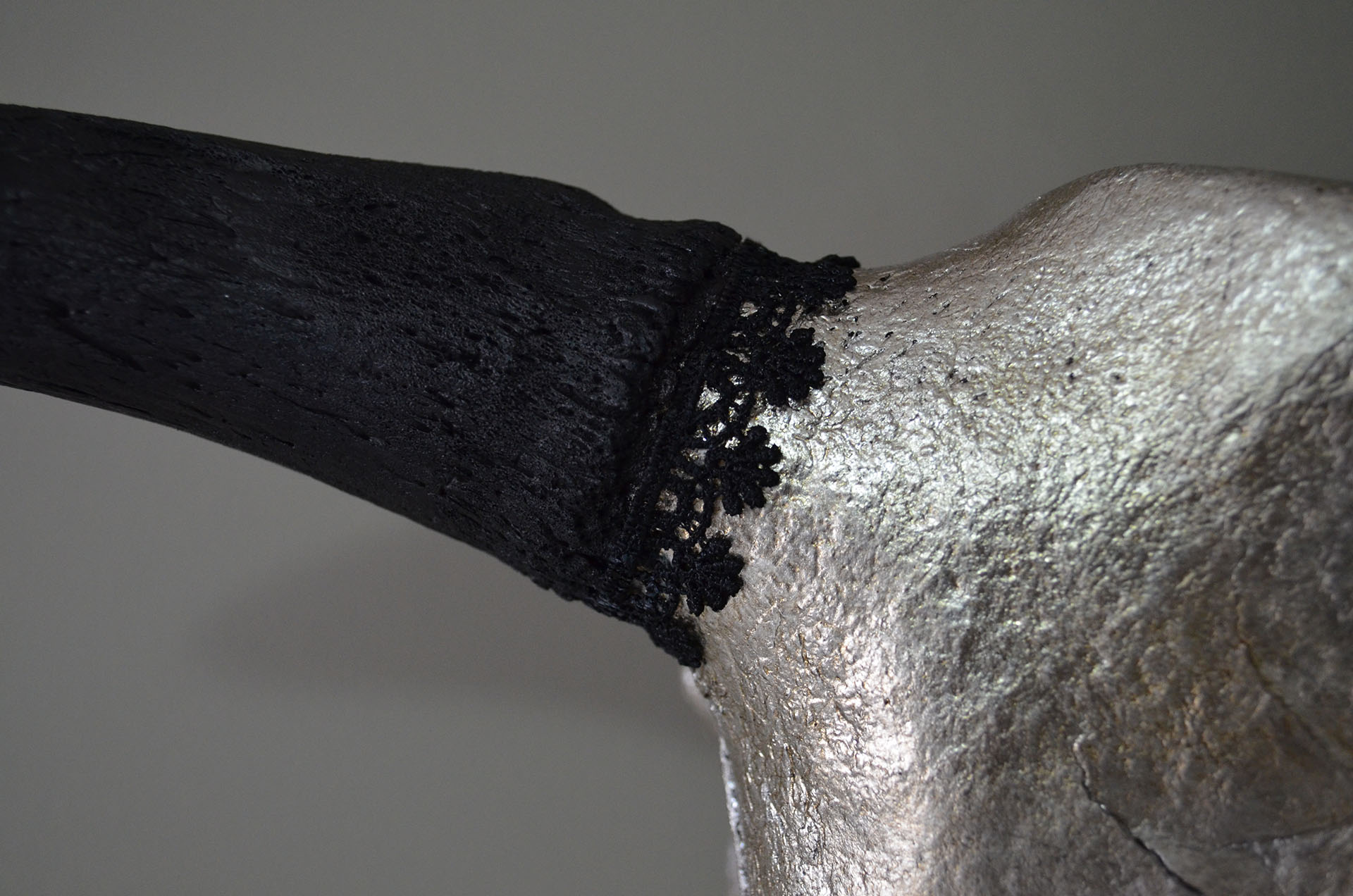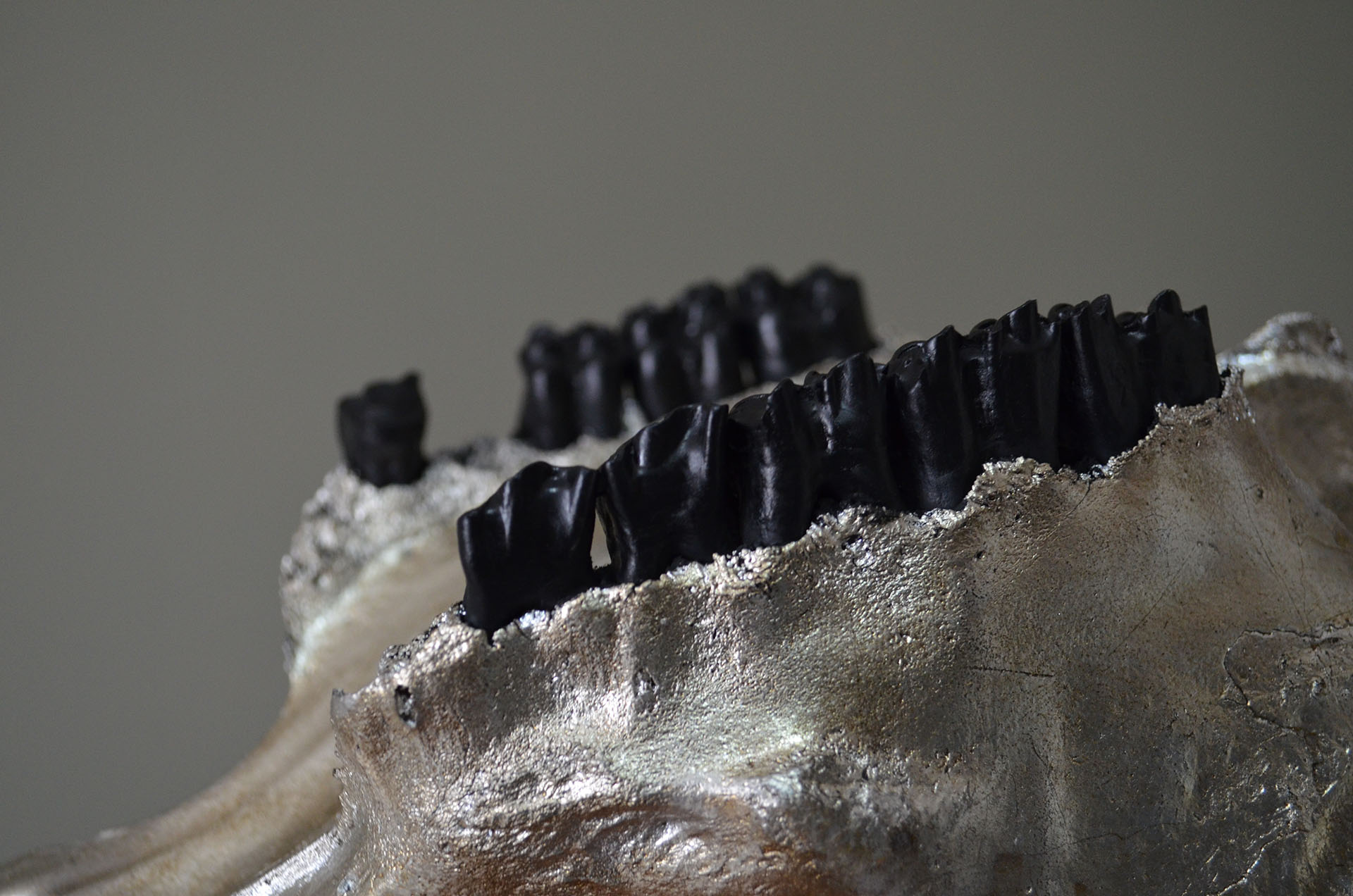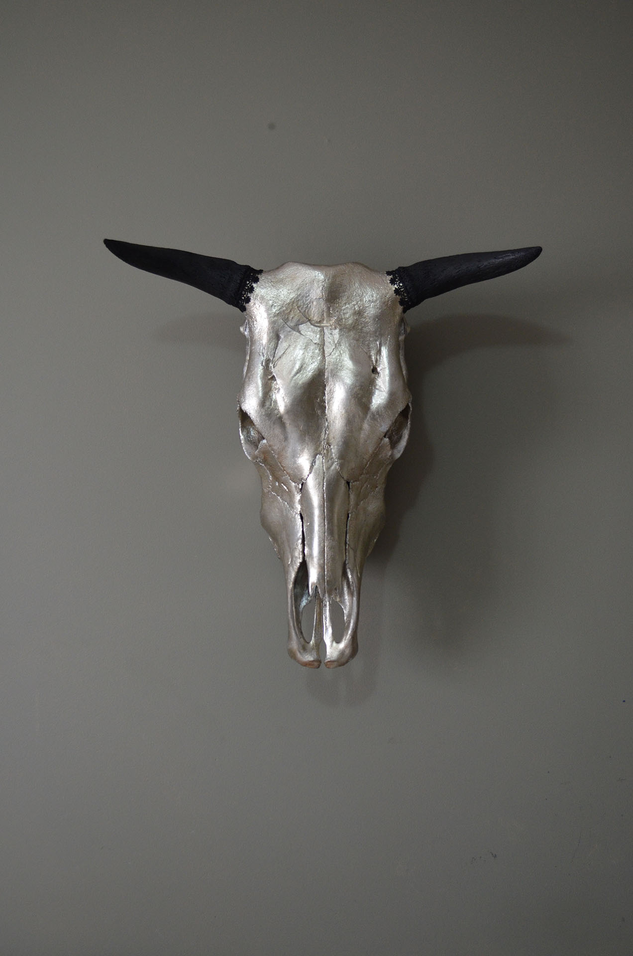Crânio de Vaca folheado a prata envelhecida com chifres e dentes em preto fosco.